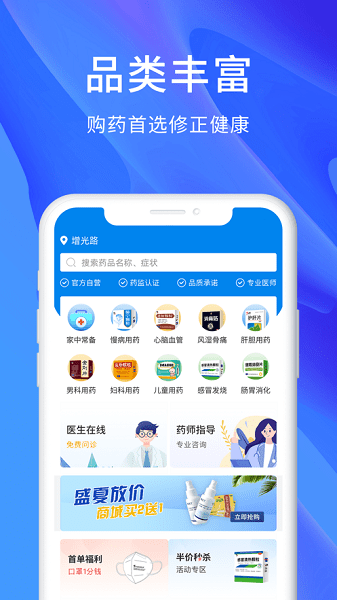 修正健康商城是一款十分优质的卖药软件,用户可以在这里线上进行买药,平台内有专门的医师帮你,根据你的需求为你介绍推荐药品,也不用担心买到假药买错药,非常的方便实用。