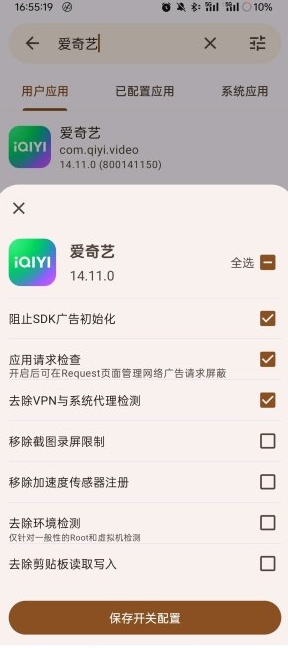 5.启动AdClose模块,选择并点击应用列表,启用相应的Hook功能。