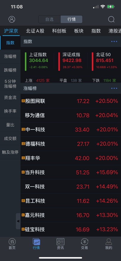 3、点击行情,即可查看最新的涨跌信息,选择自选即可查看自选股票的涨跌信息;