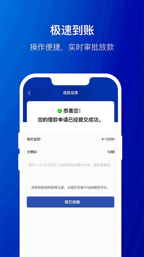 3、当用户的借钱申请通过审批后软件会快速放款,让用户借到钱;