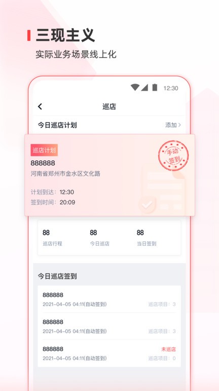 【智能签到】识别伙伴行程计划中的门店位置,判断与当前位置的实时距离,实现自动签到。并根据行程类型将签到记录转化为对应业务流程的起点,便于更有效的开展工作。