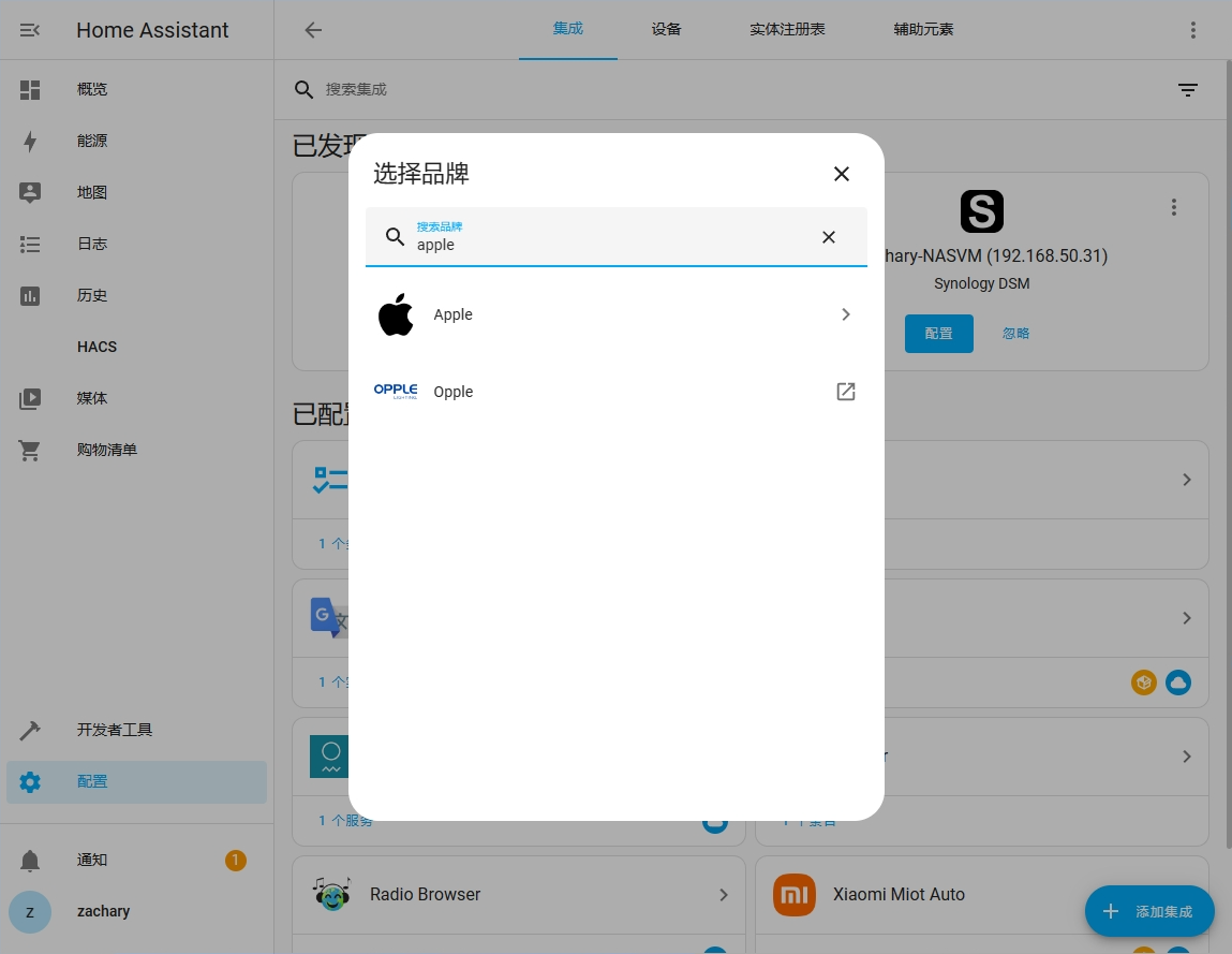 如果是苹果HomeKit设备,选择设备与服务,点击右下角添加集成,搜索homekit,选择Apple,然后根据引导操作即可。