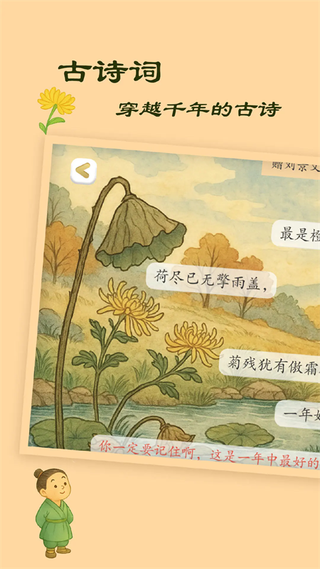 按照古诗的顺序来编排汉字的学习顺序,每学会十几个汉字,就能完整、流畅地阅读某首古诗,从而激发用户的成就感。