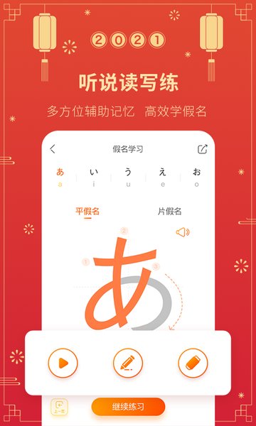 闯关式学日语,真人发音,录音跟读,手写描红,联想记忆,视频教程等。