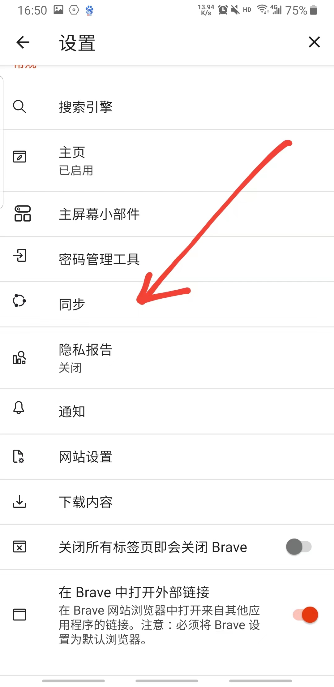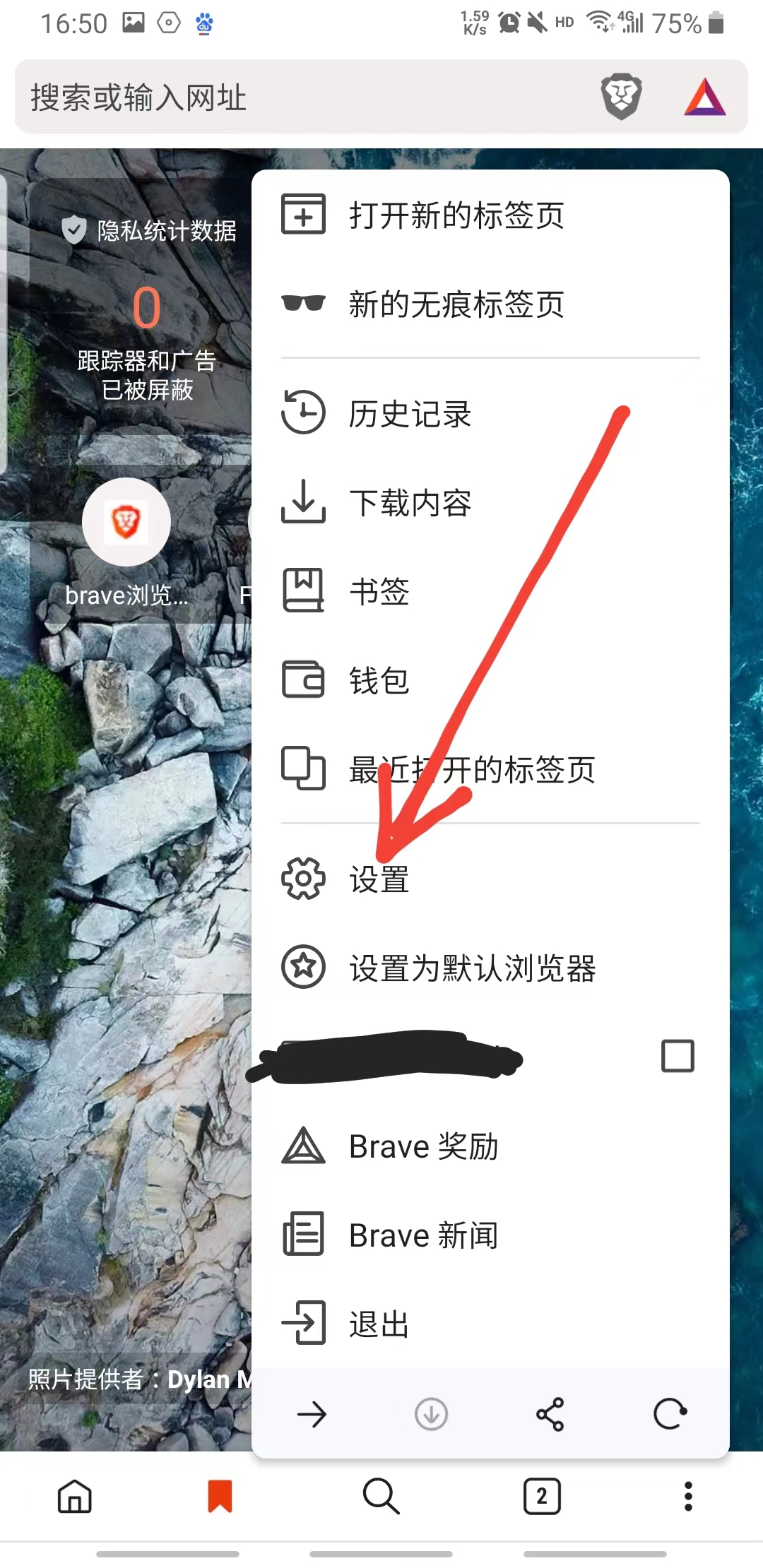 1.很多小伙伴肯定不知道brave浏览器的同步功能在哪里,可以按照下方截图来让你快速实现同步书签等功能,点击右下角三个点找到设置
