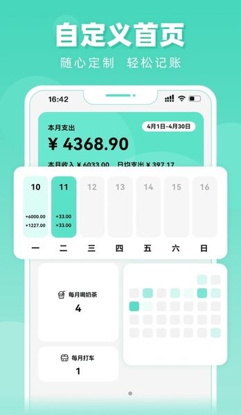 首页支持高度自定义,用户可以自由拖拽、调整卡片的位置和大小,将本月日均餐饮花费、累计喝饮料次数等数据制作成卡片放置于首页,每次进入应用时就能立即看到最重要的信息。