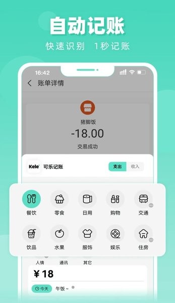 智能记账应用,支持支付宝、微信等常用支付方式,通过智能算法自动识别消费的分类、金额、备注等信息,让用户轻松完成记账,真正实现解放双手。
