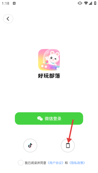 1、在“好玩部落”登录页,点击手机登录图标,进入手机号登录界面。