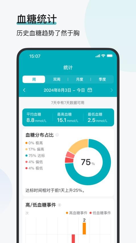 4、可以查看血糖统计数据,了解血糖趋势变化;
