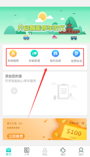 3.首页设有车牌缴费、车辆信息管理、账户余额查询及资费标准等核心功能。