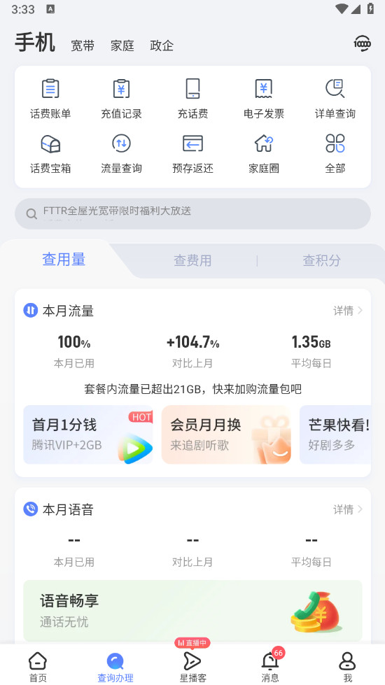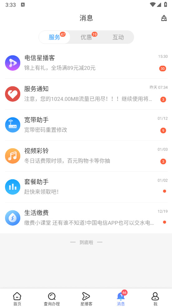 打开中国电信,点击下方的查询办理