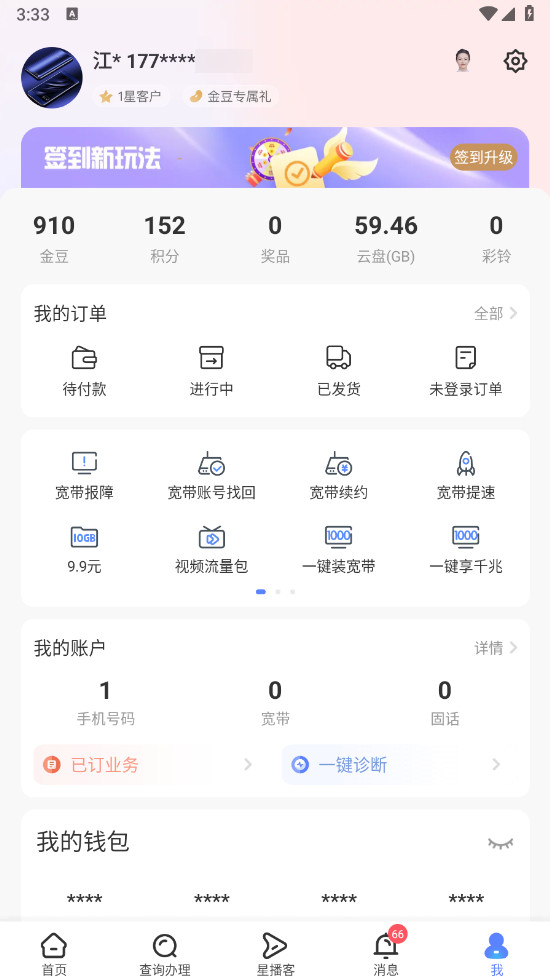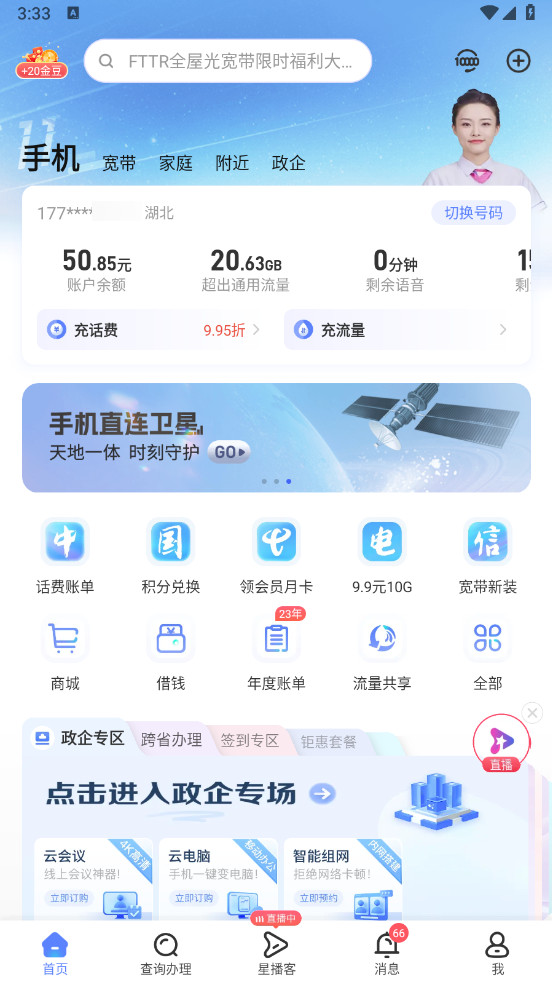 打开中国电信,首页就有显示我们的余额信息