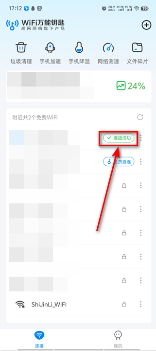 1、进入app,打开手机WiFi功能,即可自动搜索附近WiFi,有蓝钥匙表示可以直接连接,点击蓝钥匙;