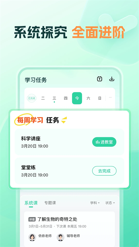 好课领航app官方版采用了非常科学的学习形式,能够为不同的用户定制出适合的学习计划,这样才能够做到因材施教。同时,该软件还拥有非常强大的在线直播课程,相关用户在这里可以积极参与到课程中去,能够与老师进行互动,能够很好的做到答疑解惑的效果。此外,用户还可以在这里进行课程下载操作,保存在本地,可以随时随地自由观看。