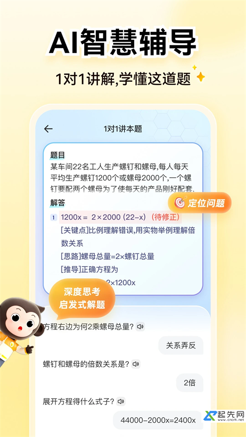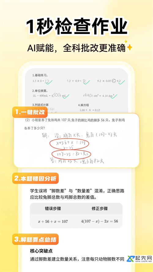 1、拍照检查,秒判对错:只需对作业拍照,一秒就能帮您判断对错,并进行针对性的分析辅导,让孩子“知错能改”;