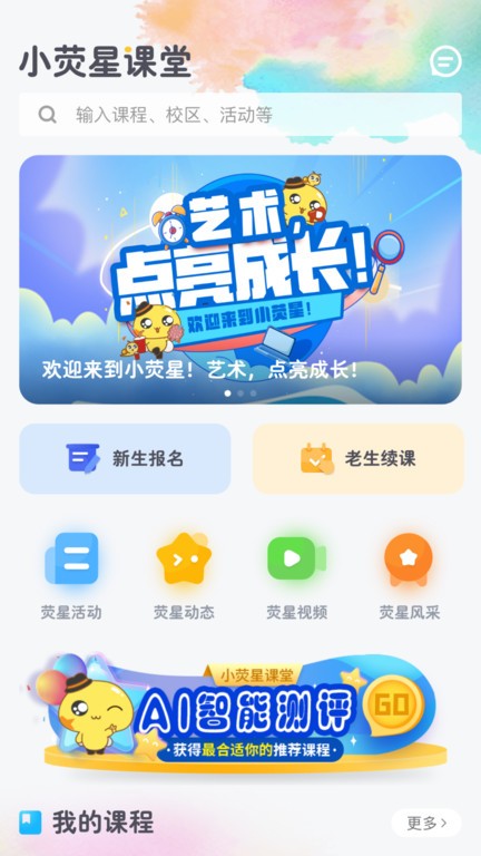 小荧星艺术培训app包含的艺术课程丰富多样,唱歌跳舞、主持演讲等一应俱全,能够从小培养孩子的艺术细胞,可以在线报班,能够查看详细的课程表以及学习进度,还能在线查看老师布置的家庭作业!