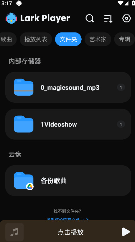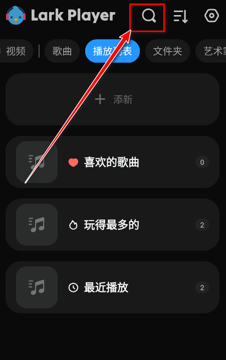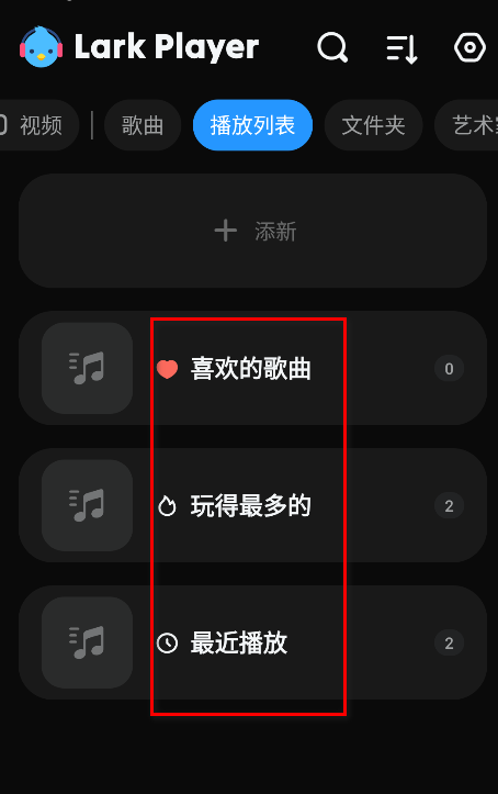 1.打开云雀播放器进入首页,会看到首页上方支持视频、歌曲、播放列表、文件夹、艺术家、专辑等几个大板块的内容。