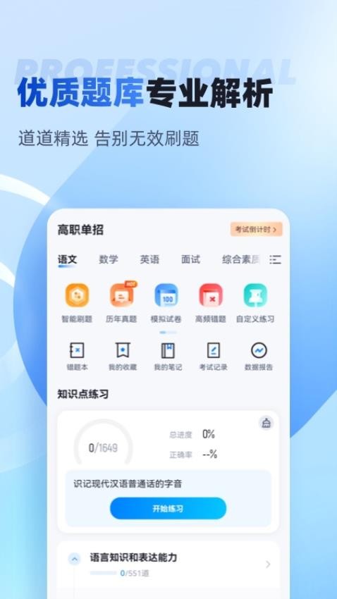 单招聚题库app这是一款具备独特知识备考和学习教育功能服务的应用软件,在这里内置详情的学习报告分析与总结,能够帮助用户轻松手机在线模拟考试,各种优质考试题库和答案解析汇集于此,帮助用户轻松解决各种难题和不理解内容,以后大家在此备考模拟测试将更加的效率;除此之外,在单招聚题库最新版软件APP当中具备智能数据分析,帮助用户轻松进行单招院校对比,快速找到更加适合的院校;而且该平台是由长沙聚优教育咨询有限公司专门为用户朋友们研发提供的备考教育工具;对这款软件感兴趣的小伙伴可以来本站下载体验!
