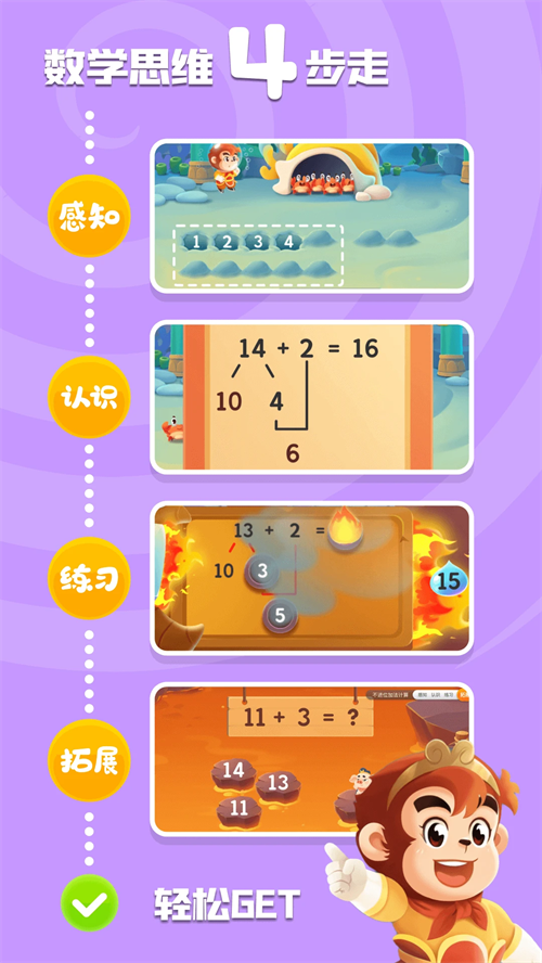 悟空数学同时支持电脑、手机、平板、等设备使用,还支持电视使用哦!使用同一账号,学习进步就会保持同步!产品单元设计由浅入深,根据孩子的年龄和认知程度进行划分为三阶,可以根据孩子情况有选择得进行学习。
