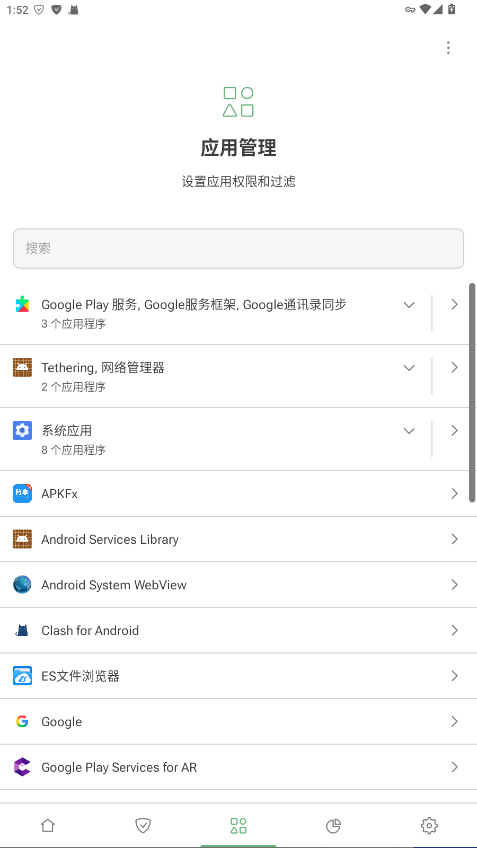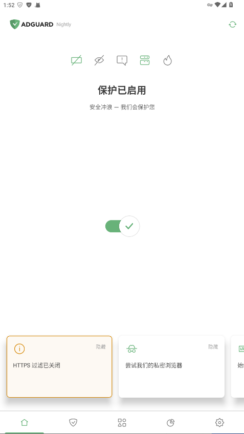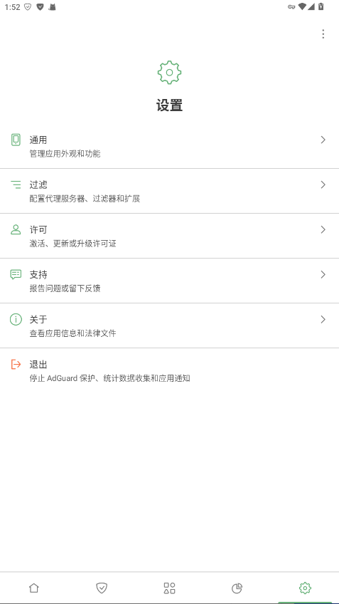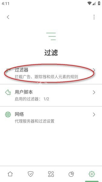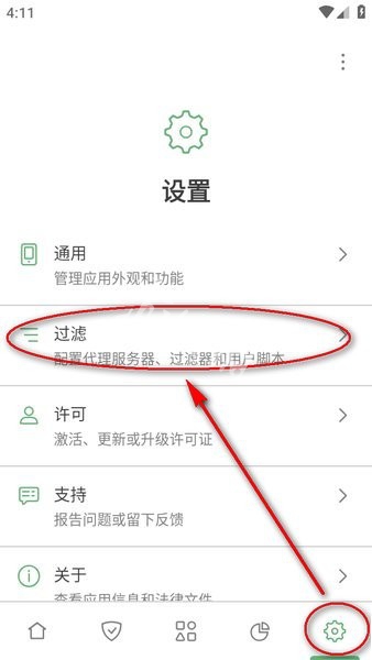 7.打开adguard后,点击右下角的设置图标,并选择“过滤”,如图所示;