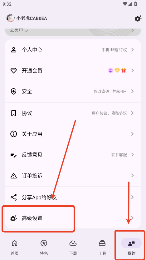 1.在我的界面点击高级设置。