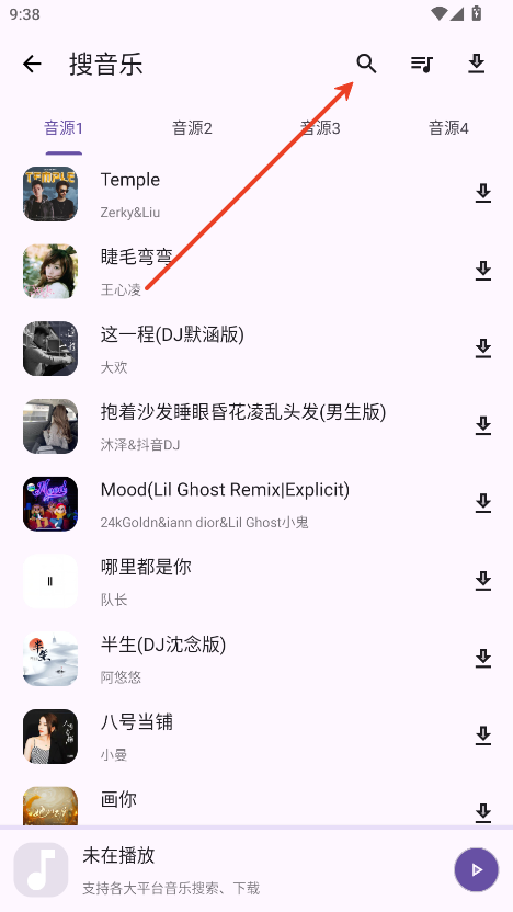 2.在右上点击放大镜按钮,搜索你要听的歌曲。