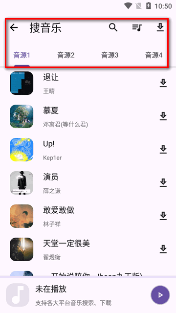 3、进入搜音乐界面,可选择音源后点搜索按钮。