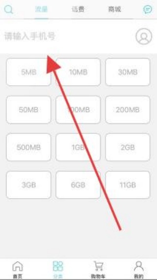 3.切换到流量购买页面,在输入框处准备输入手机号码,下方选择合适流量套餐,进行流量购买操作。