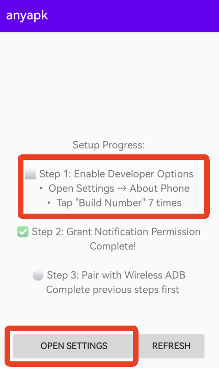 4、之后回到anyapk软件内可以看到我们的第一步前面有了绿色的√。接下来就是开始第三步,与无线ADB配对。再次点击左下的【OPEN SETTINGS】。