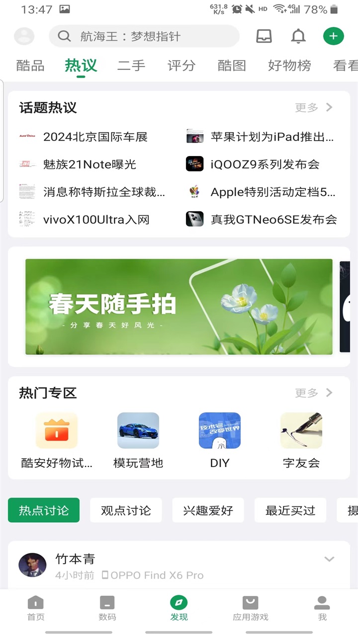2、酷安论坛的话题也是比较热门的,它会把相关的话题放在一起讨论,这样就更方便于观看者的浏览,查找和回复。这也是酷安论坛作为半社交软件的一大特点。我们随机抽取了一个内容,头图给整体带来一种简约而又不失内容的设计,就像一加的氢壁纸,给人一种一目了然的感觉。而底面的图标设计也很简洁,纯白搭配酷安绿很好看。其中酷安论坛也具备了酷图的功能,酷图就可以免下载一个壁纸软件,用户可以投稿自己喜欢的酷图分享。酷图里面的壁纸还挺好看,已经可以满足个人的个性化使用。