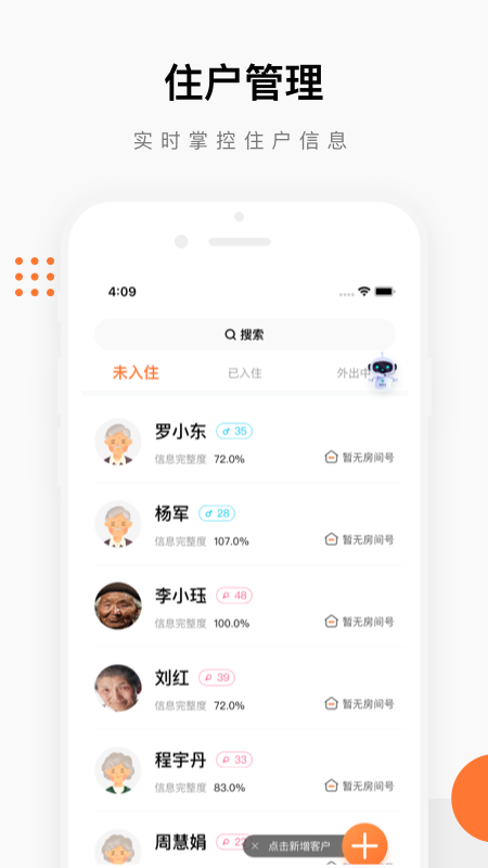 【客户管理更方便】承办机构可以便捷查询该机构的住户信息,对外出情况及时掌控,充分提升院内的安全管理能力。
