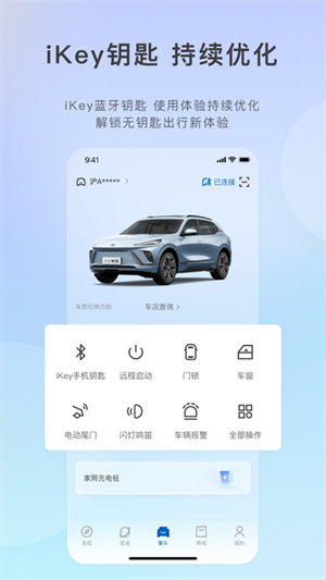 你的爱车电量、续航里程以及胎压车况随时查看,同时通过iKey蓝牙钥匙可以一键完成车辆远程启停、上锁解锁、开闭天窗等便捷操作。还有预约维保、道路救援、上门取送车等更多贴心服务,为你的行车安全与便利保驾护航。