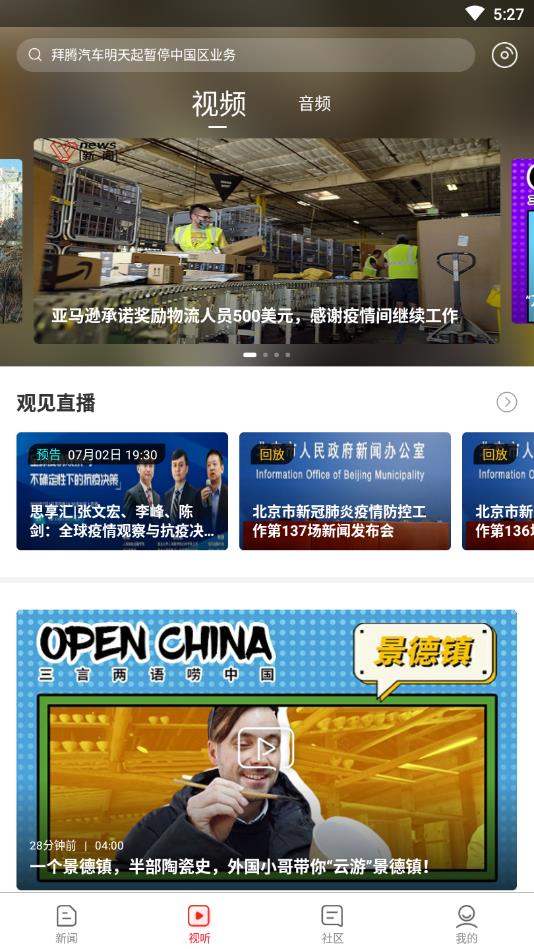 观见直播:第一时间实时直播新闻热点,重大政经会议,重要商业发布会,高清观看珍稀野生动物。一流技术确保清晰稳定多角度直播流,多档原创直播栏目展现新闻策划实力。