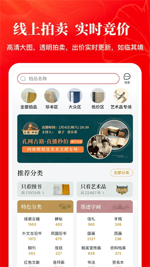 每日新增10000种拍品,从明清古籍、民国期刊、名人信札,到字画、连环画、邮票、古钱币到古玩杂项,都能够以合适的价格购得。