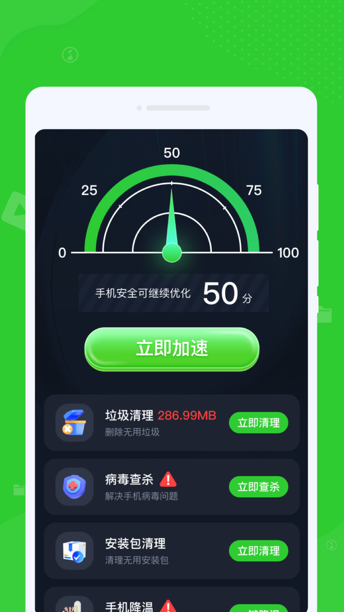 3、一键清理冗余:深度扫描垃圾文件、缓存残留,一键即可清理,快速释放手机存储空间。