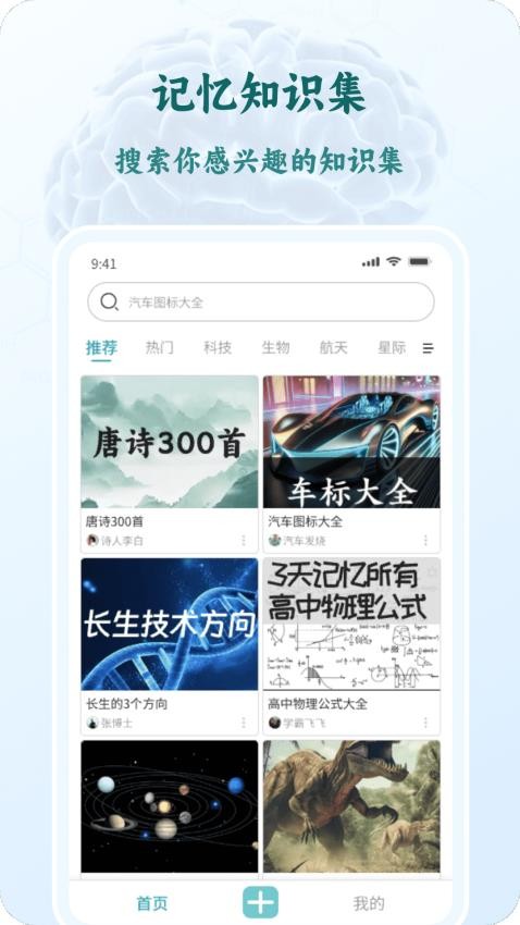 忘否app是一款帮助用户整理知识点的软件,用户可以将自己需要记忆的各种知识点进行记录管理,可以将各种知识点进行精细化的分类管理,让你随时查找知识点更加快捷方便,软件中整合了大家所分享的各种知识点,包括科技、生物、航天、星标等各种领域类型的知识点可供用户查看学习,还可以通过知识搜索的方式查找你想要学习的知识集进行学习查看,其中还将各种热门的知识集进行了精选推荐,便于用户轻松查找各种热门的知识集学习使用,开启记忆模式即可通过标题帮你回想知识点内容高效记忆知识,有需要的用户就快来下载忘否官网版软件进行使用吧!