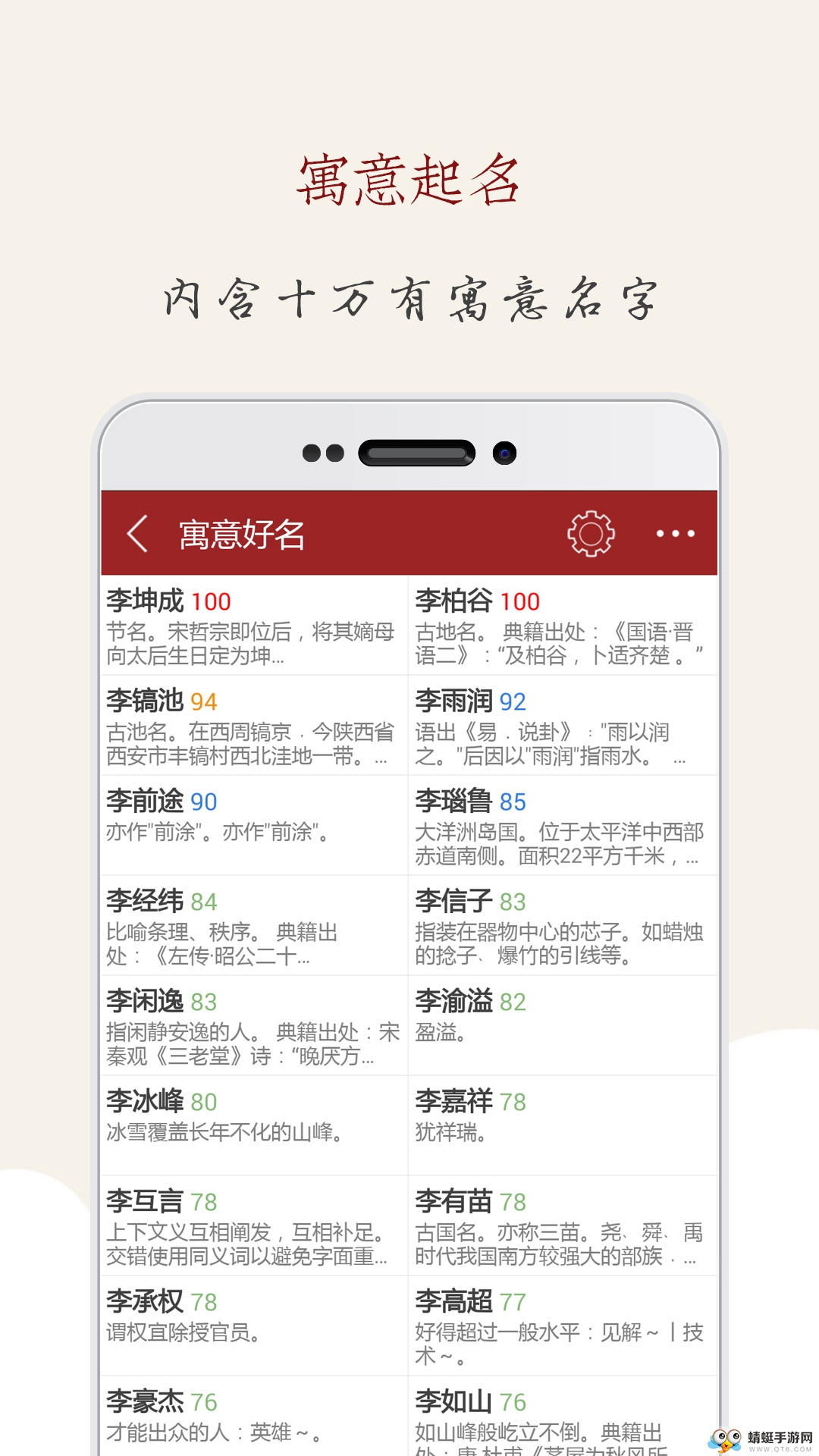 拥有十万有寓意的好名字,通过寓意为用户取名字,还能筛选高分好名字。