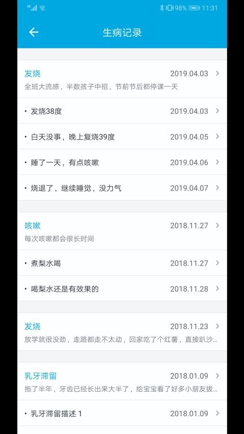 宝宝日常每一次生病都能添加记录,随时都能保存生病的情况,便于贴心呵护;
