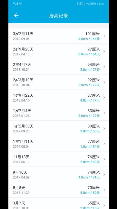 3、在身高记录板块,可轻松添加宝宝最新身高数据,还能知晓宝宝长高情况;