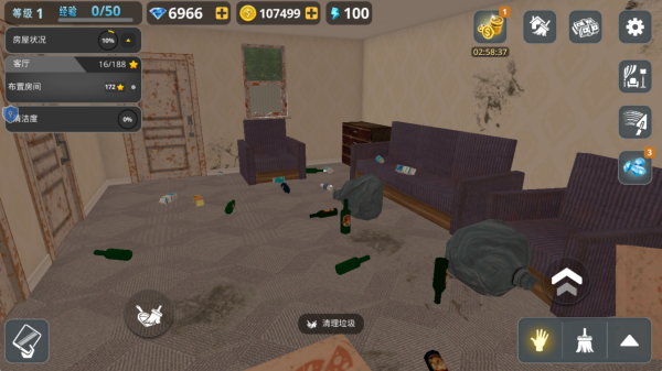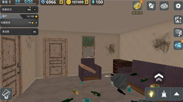 1、左侧屏幕点击可以呼出移动轮盘,右侧控制各类交互按钮,清理房间垃圾。