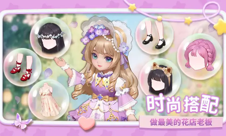 1.进入游戏后,首先可以体验“时尚搭配”的特色玩法,例如为角色选择不同的发型、服装、鞋子和配饰,打造个性化的花店老板形象,展现独特的时尚品味。