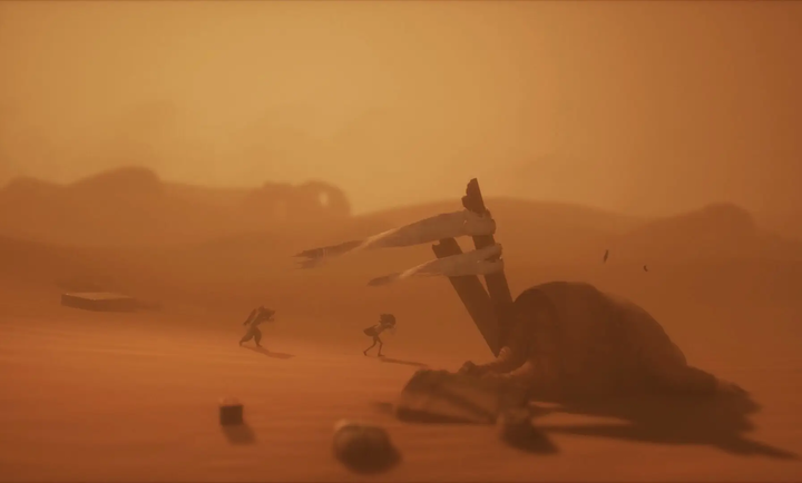 1、沙漠杳无人烟、荒凉且令人绝望,开场便是一段令人迷茫的沙漠漫步,荒凉、空旷、风沙肆虐,除了自己和同伴,唯一的活物只有乌鸦。