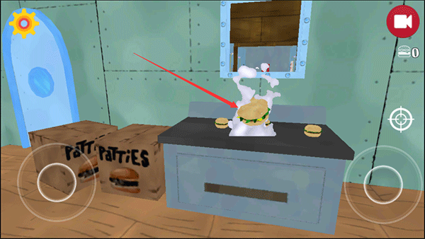 1、进入游戏会出生到蟹堡王的门口,我们可以通过左侧的轮盘控制海绵宝宝移动,右侧的轮盘控制视角;