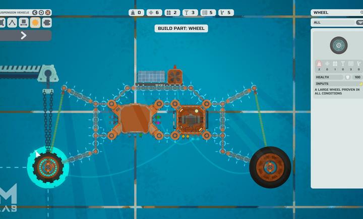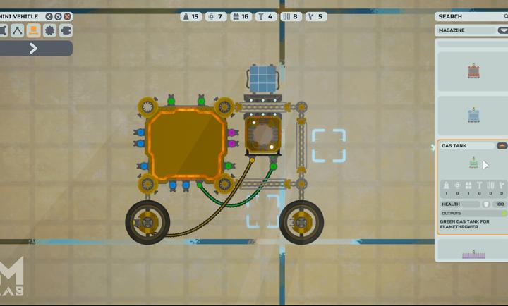 3、深度策略与战斗,可调整零件颜色、速度甚至功能,例如将普通轮子改为带刺的战斗轮,或为机甲手臂加装链锯。