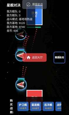 1. 多元战斗模式:涵盖4种主模式,满足不同需求——常规舰队战支持1V1单舰决斗、3V3小队配合、5V5大规模决战;无限模式主打无尽波次挑战;沙盒模式可自由放置7类星舰(含护卫舰、航母、战略指挥舰等)并自定义双方舰队;基地攻防战需守护基地(初始血量10000)并利用金币(初始1000)购买战舰。
