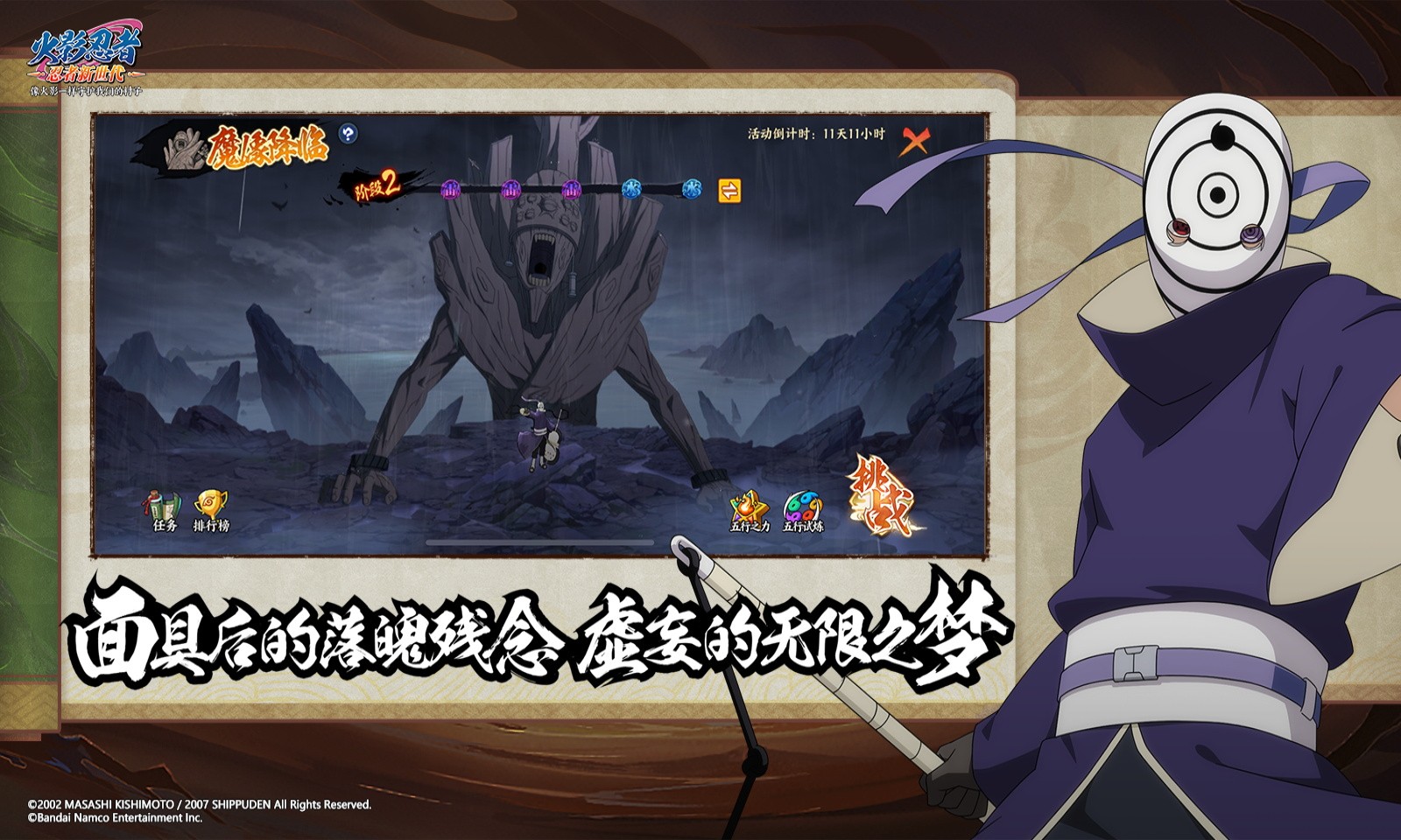 全新“百豪解限”版本上线,强忍降临---纲手[忍界大战]登场! 【新增内容】 1、新忍者:纲手[忍界大战]、宁次[新年]、鬼灯幻月[二代水影]、漩涡博人[新年]将陆续和大家见面 2、新活动:“天马行空”主题系列活动将在春节开启,腾跃迎春、流光溢彩、破局迎新、年兽大作战等趣味活动等你来参与 3、新图鉴:千手兄弟、忍战·五影集结 4、新春时装:天马行空 5、新春场景:马年新春主题场景开放 【新春福利放送】 1、新春家具 2、新春称号 3、新春头像框 4、新春主题时装 5、新春红包 6、限时登录领30连抽 体验火影忍者大世界,即刻进入《火影忍者:忍者新世代》!