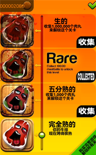 2、有四种不同程度的牛排制作程度,需要你来进行收集解锁更多的关卡。
