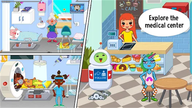 探索数十个可爱、逗趣且独具特色的角色:人类、宠物、怪物、外星人和一个初生的婴儿。所有这些都在等候着你!加入佩皮角色,探索医疗中心,在游戏中享受乐趣并创造自己的故事。