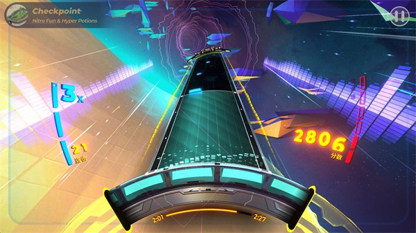 3、进入关卡后玩家将通过转动轮盘的方式来把控节奏获得分数,屏幕左侧的是连击数和加成倍数,右侧是玩家本局的分数和血量,如果血量为零就会挑战失败。