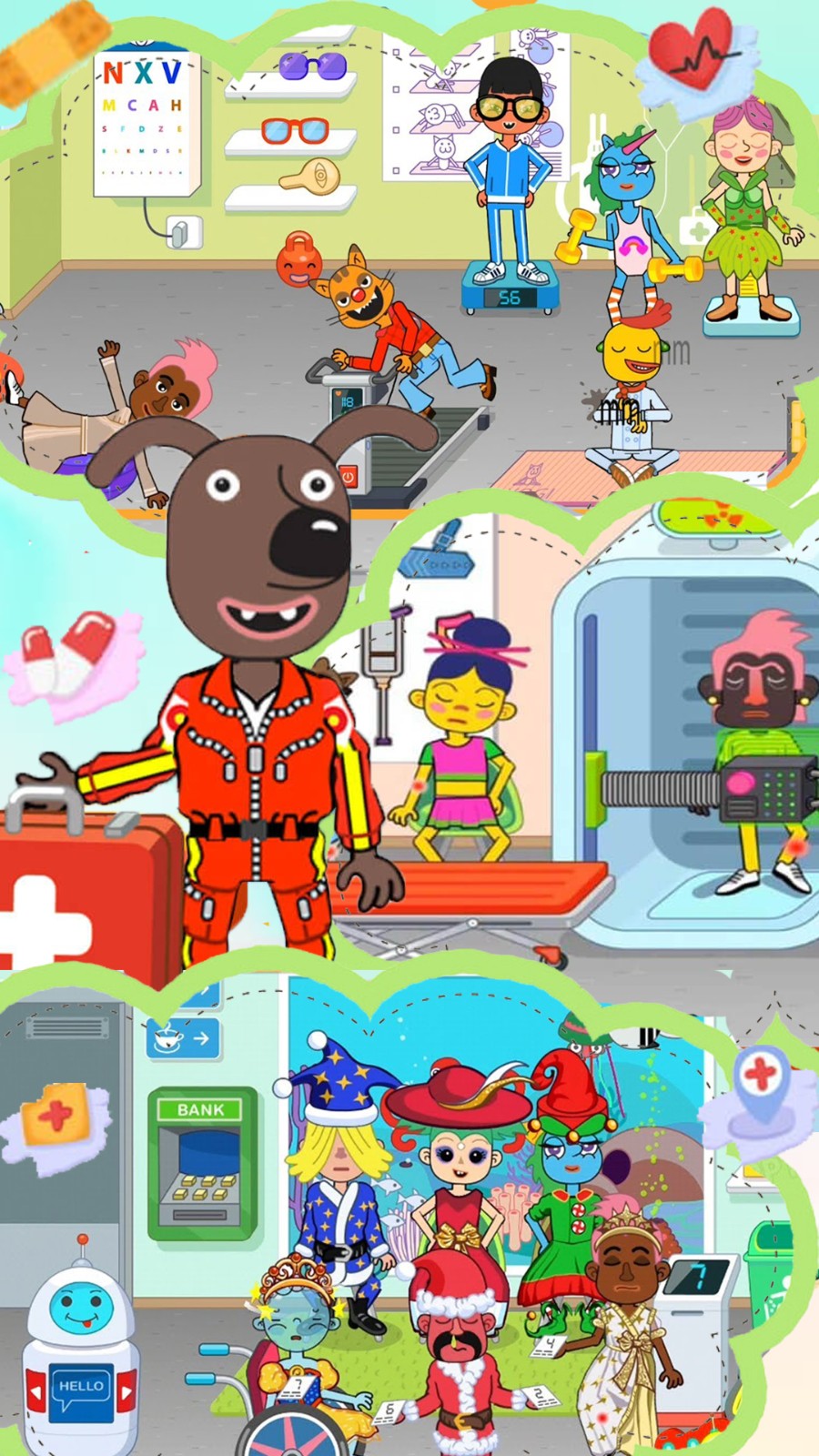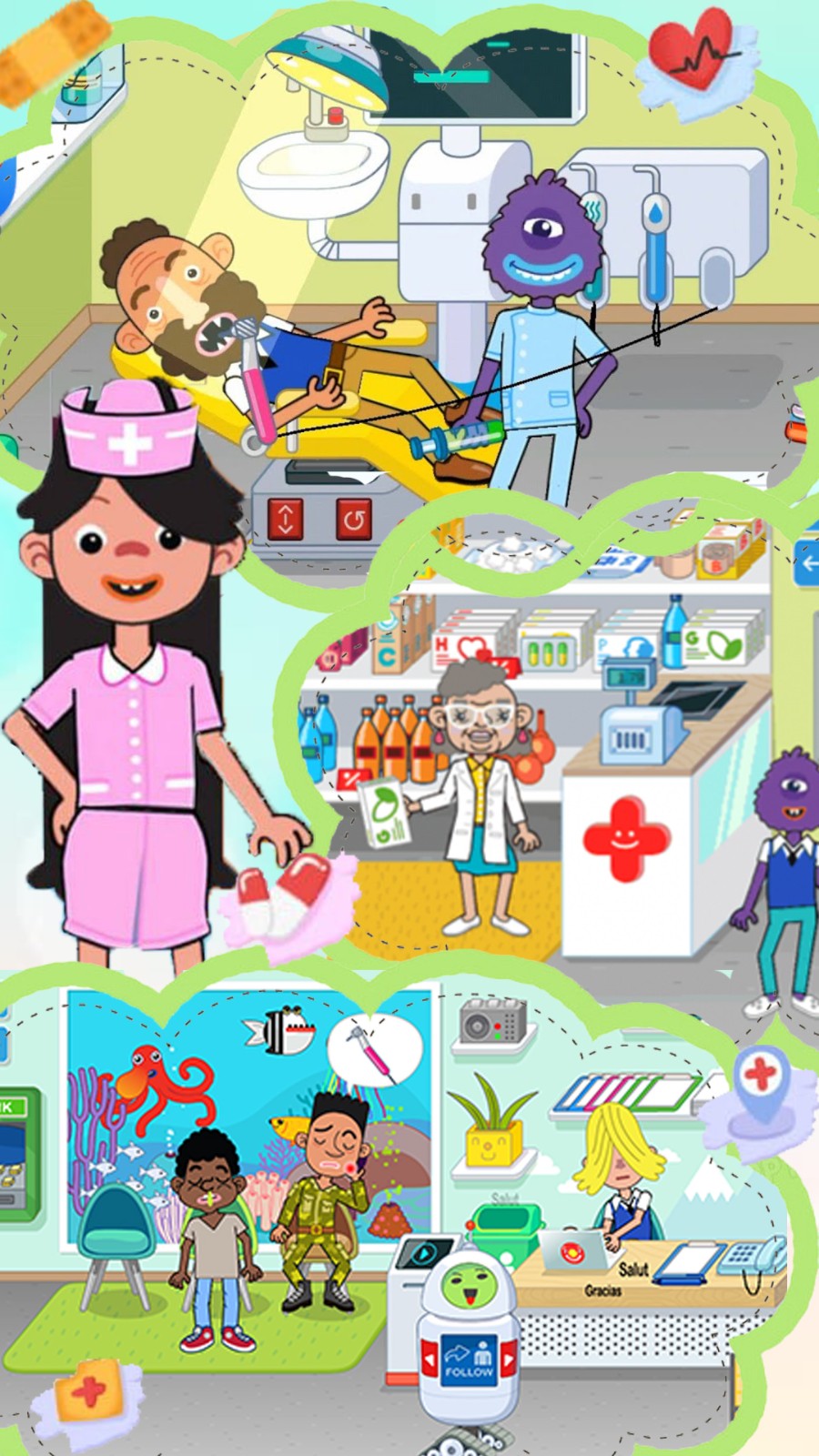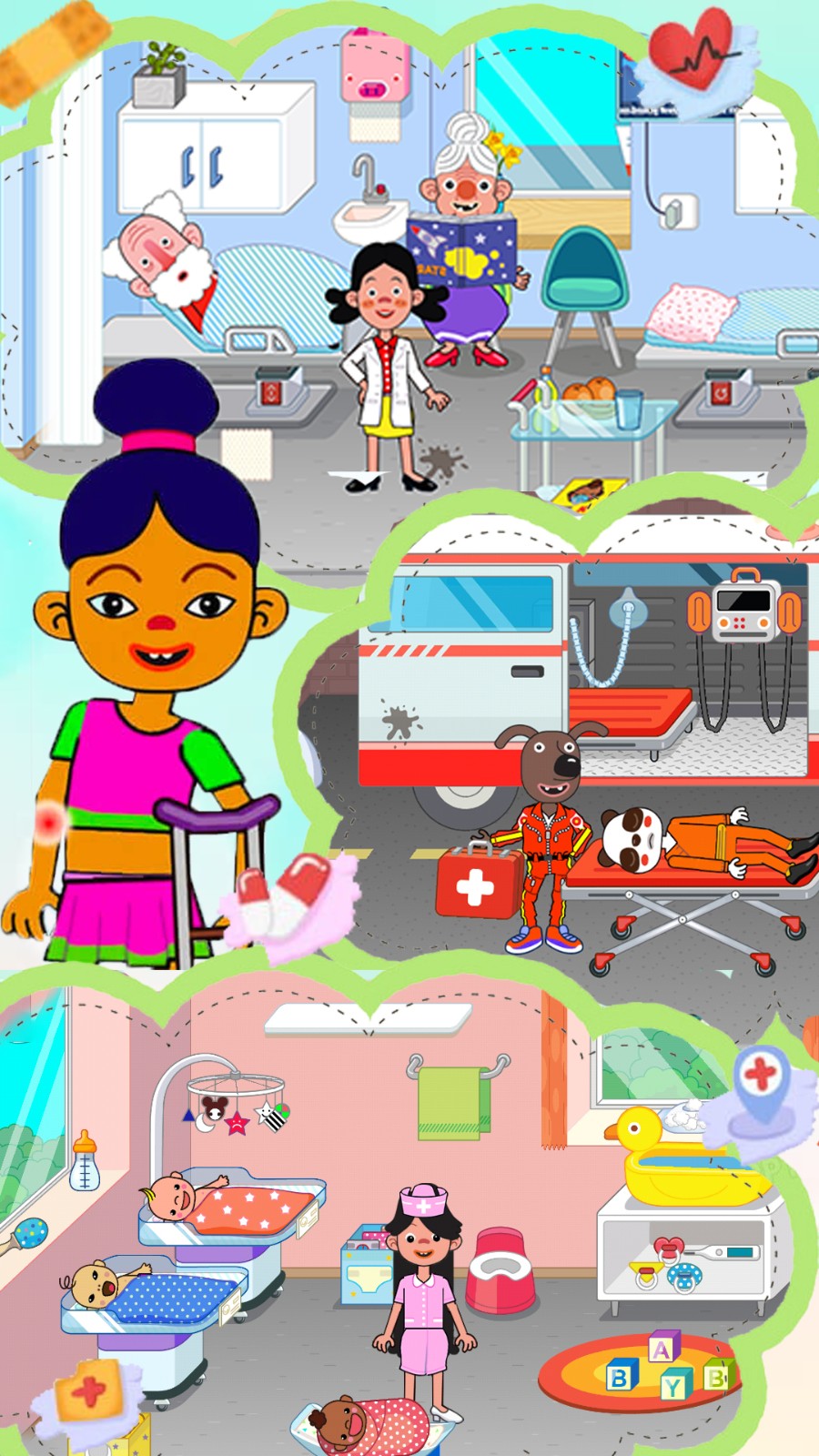 1.进入迷你奇妙宝宝医院中,体验医院中的不同职业的生活,并且可以不断的更换你的工作。